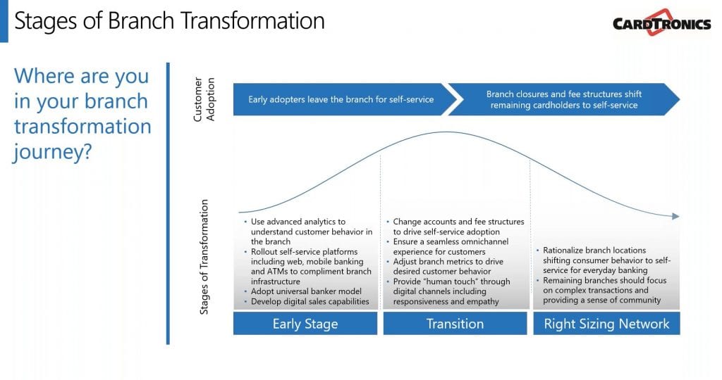 The webinar featured Justin Upton, General Manager of ATM Branding Solutions at Cardtronics, and Sarah Grotta, Director of Debit and Alternative Products Advisory Service at Mercator Advisory Group. During the event, Upton and Grotta discussed what branch transformation entails, trends in consumer banking prior to the outbreak of COVID-19, how the pandemic has influenced these trends, and what this all means for the future of banking.