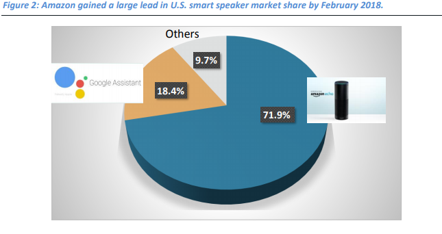 The lion’s share of the smart speaker market is dominated by Amazon’s Echo, constituting 71.9% of the smart speaker market, according to Mercator Advisory Group. In second is Google Assistant with 18.4% of the market.