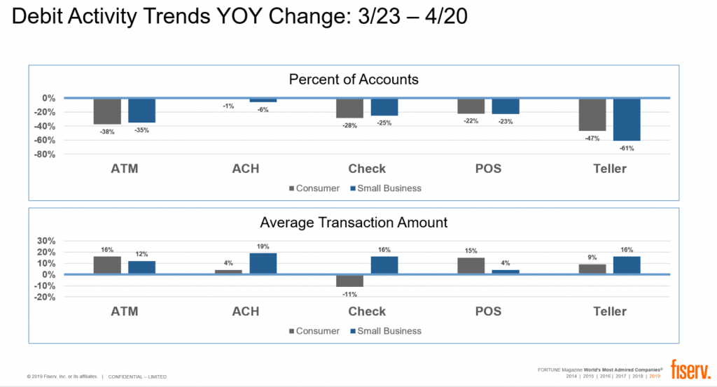 Similarly, small businesses have furloughed employees and reduced spending while receiving government assistance in the form of the Paycheck Protection Program (PPP) and EIDL loans and grants. As a result, small businesses have seen a similar jump in account balances, which is apparent in Fiserv’s charts on YOY weekly balance changes in consumer and small business accounts for the weeks of 4/13 and 4/20: